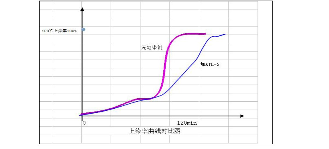 按照上述工艺曲线,从50℃开始,每个温度梯度染10分钟,从布面颜色的变化和染液中未上染的染料的浓度可评估匀染剂ATL-2的匀染性能和对染料的配伍性能的影响。